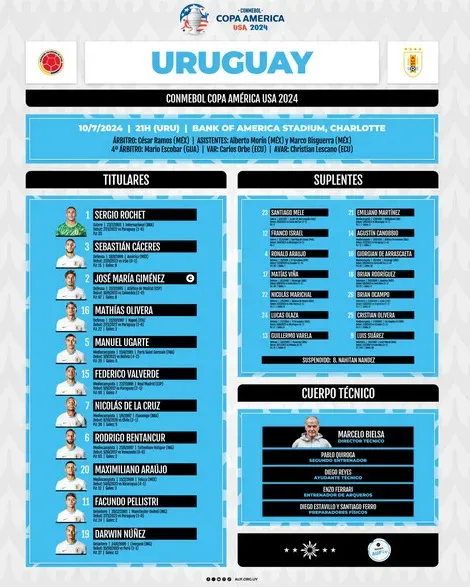 A Seleção Uruguaia vem a campo com Rochet, Cáceres, Giménez, Olivera, Ugarte, Valverde, Nico De La Cruz, Bentancur, Maximiliano Araújo, Pellistri e Darwin Núñez, sob comando do técnico Marcelo Bielsa.