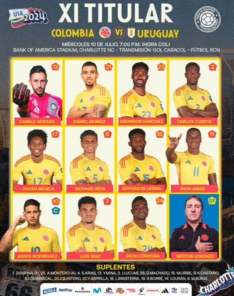 A Seleção Colombiana vem a campo com Camilo Vargas, Daniel Muñoz, Dávinson Sánchez, Carlos Cuesta, Mojica, Richard Ríos, Jefferson Lerma, Jhon Arias, James Rodríguez, Luis Díaz e Jhon Córdoba, sob comando do técnico Néstor Lorenzo.