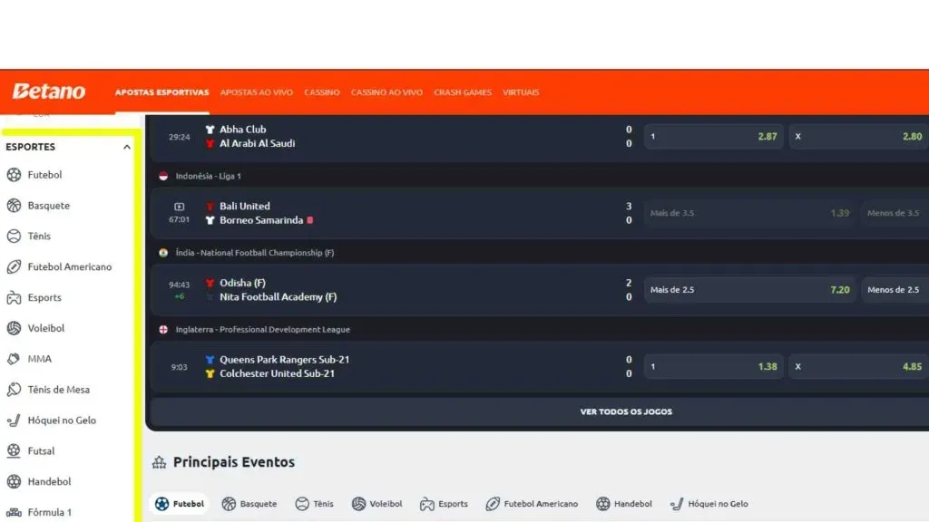 2 – Depois, escolha um dos esportes listados na barra lateral;