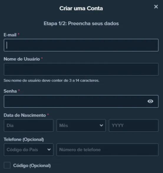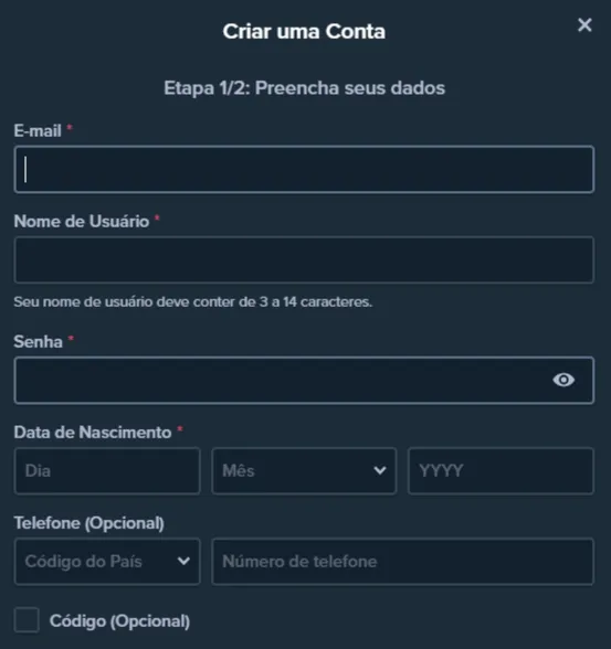 - Preencha o formulário de inscrição com seus dados pessoais: E-mail, Nome de Usuário, Senha, Data de Nascimento, Telefone (opcional), Código promocional (opcional);