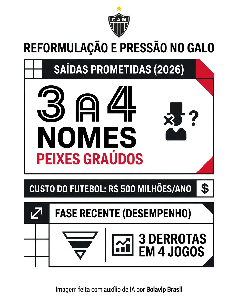Segundo informações do jornalista Jorge Nicola, um acionista da SAF do Atlético-MG prometeu a saída de jogadores importantes do elenco ainda em 2026. Em meio à fase instável, o dirigente indicou que nomes de peso podem deixar o clube por falta de comprometimento.