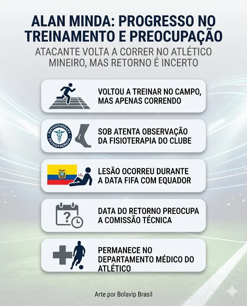 Nada de treino com bola, nada às pressa. Apenas o básico, sob olhar atento da fisioterapia e da preparação física do clube. A lesão de Alan Minda não nasceu em solo mineiro, nem em jogo qualquer do Atlético. Veio de longe, da última Data Fifa, quando o atacante estava a serviço da seleção do Equador.
