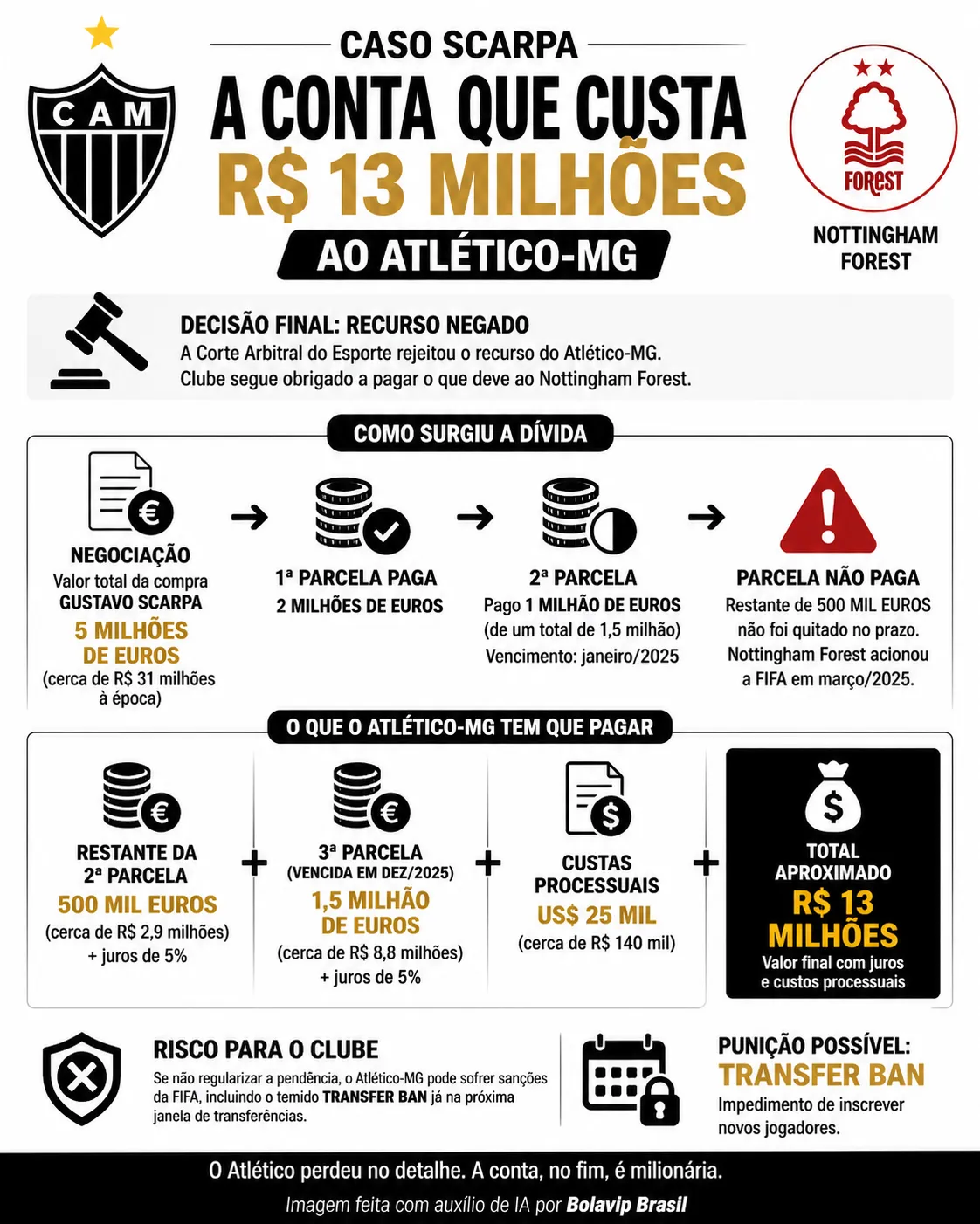 A conta, agora, vem fechada e com acrréscimos nada simbólicos para o Atlético-MG. São 500 mil euros da segunda parcela — algo em torno de R$ 2,9 milhões — acrescidos de juros de 5%. Não para por aí. A última parcela, vencida em dezembro de 2025, soma mais 1,5 milhão de euros (cerca de R$ 8,8 milhões), também com os mesmos 5% correndo por fora. Como se não bastasse, entram na conta 25 mil dólares de custos processuais. No fim da linha, o que era uma pendência administrável vira um compromisso de aproximadamente R$ 13 milhões.