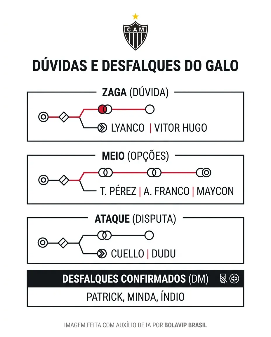 Segundo o ge, a principal dúvida está no sistema defensivo, onde duas opções disputam espaço ao lado de Ruan Tressoldi, já garantido entre os titulares. Lyanco e Vitor Hugo brigam pela vaga e seguem sendo observados pela comissão técnica nos ajustes finais antes da partida.