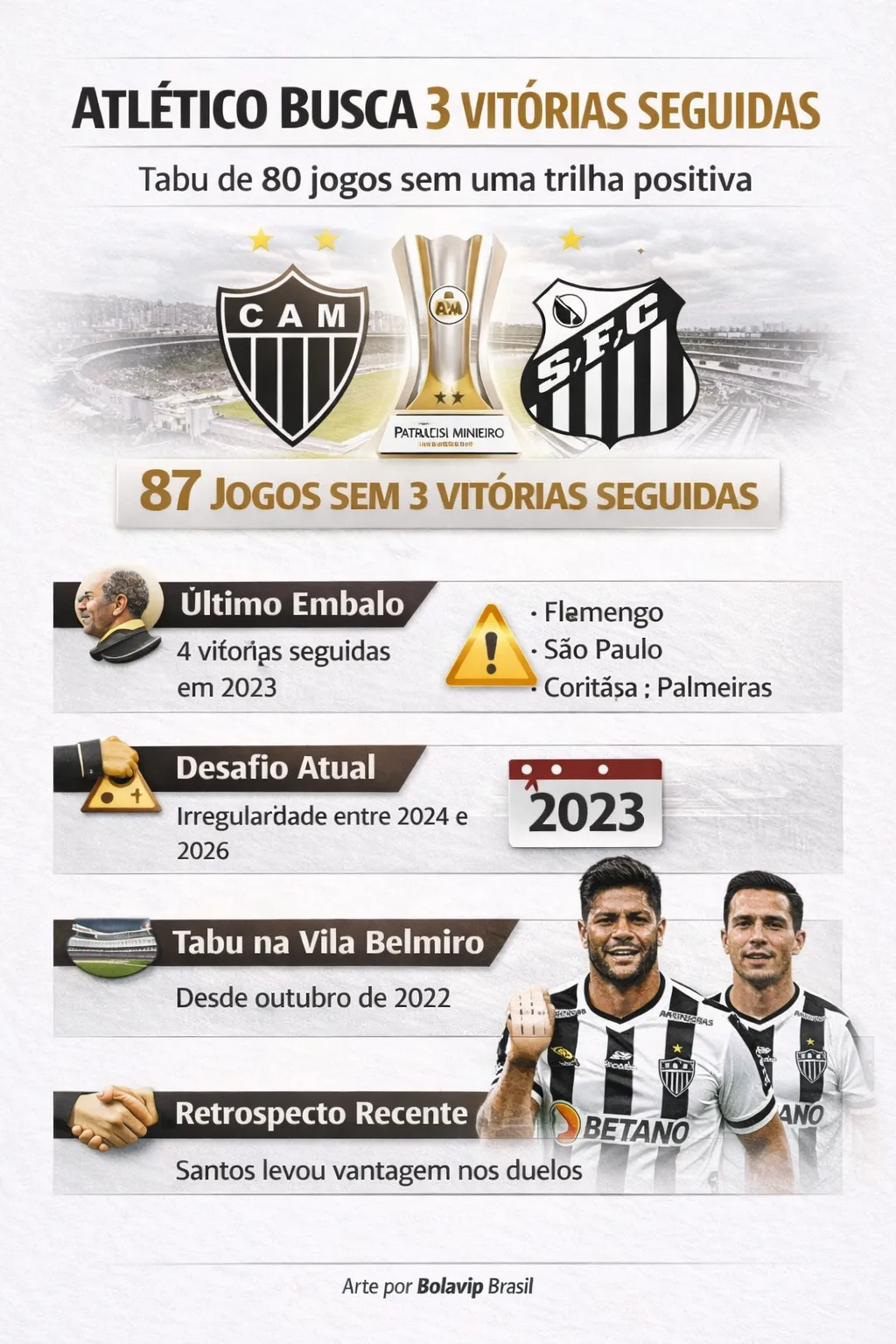 O Atlético Mineiro entra em campo neste sábado diante do Santos, pela 11ª rodada do Brasileirão, com um objetivo claro: quebrar um tabu que já ultrapassa a marca de 80 jogos sem alcançar três vitórias consecutivas na competição.