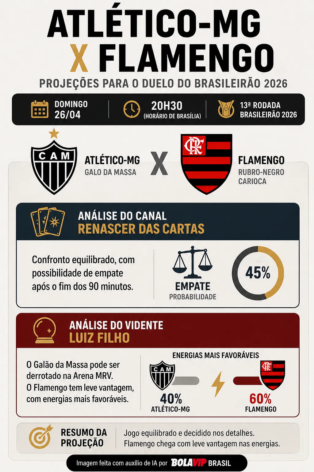 Por outro lado, o vidente Luiz Filho afirmou que o Galão da Massa pode ser derrotado na Arena MRV, pela 13ª rodada do Brasileirão. De acordo com o especialista, o Rubro-Negro Carioca tem leve vantagem, com energias mais favoráveis.