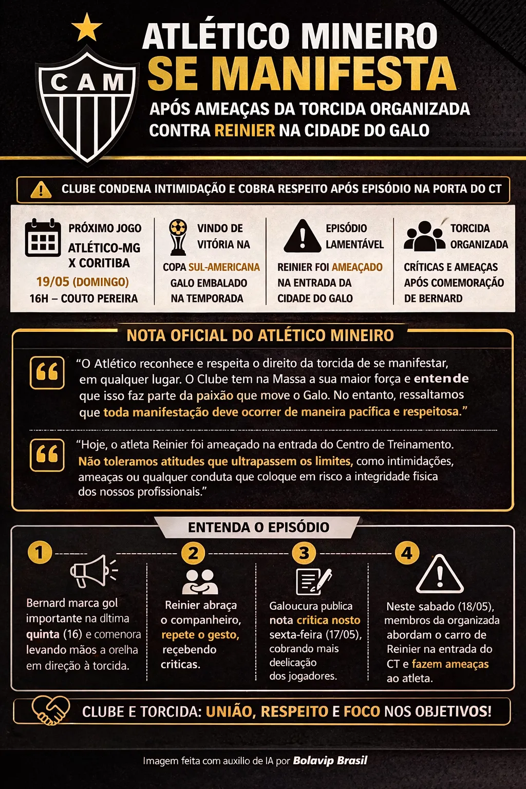 Em nota oficial, o Galo destacou que respeita o direito de manifestação dos torcedores, mas reforçou a necessidade de que isso ocorra de forma pacífica. O clube também condenou qualquer tipo de ameaça ou intimidação.