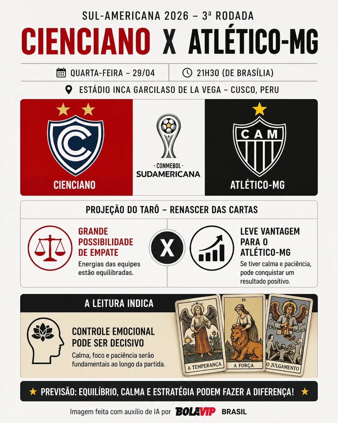 Por outro lado, no tarô, o vidente apontou uma leve vantagem para o Atlético Mineiro. Ele afirmou que, se a equipe tiver calma e paciência, pode conseguir um resultado positivo. A leitura indica que o controle emocional pode ser decisivo ao longo da partida.