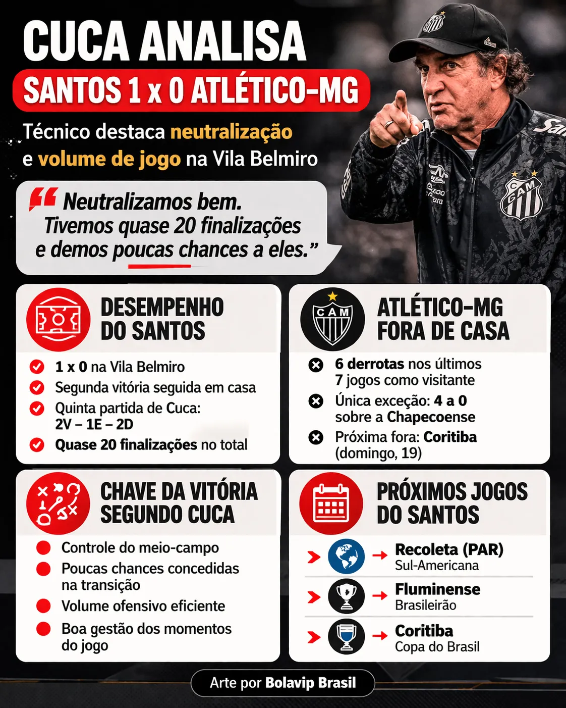 Cuca analisa Santos x Atlético-MG na Vila e revela principal razão da derrota atleticana: “Neutralizamos bem”