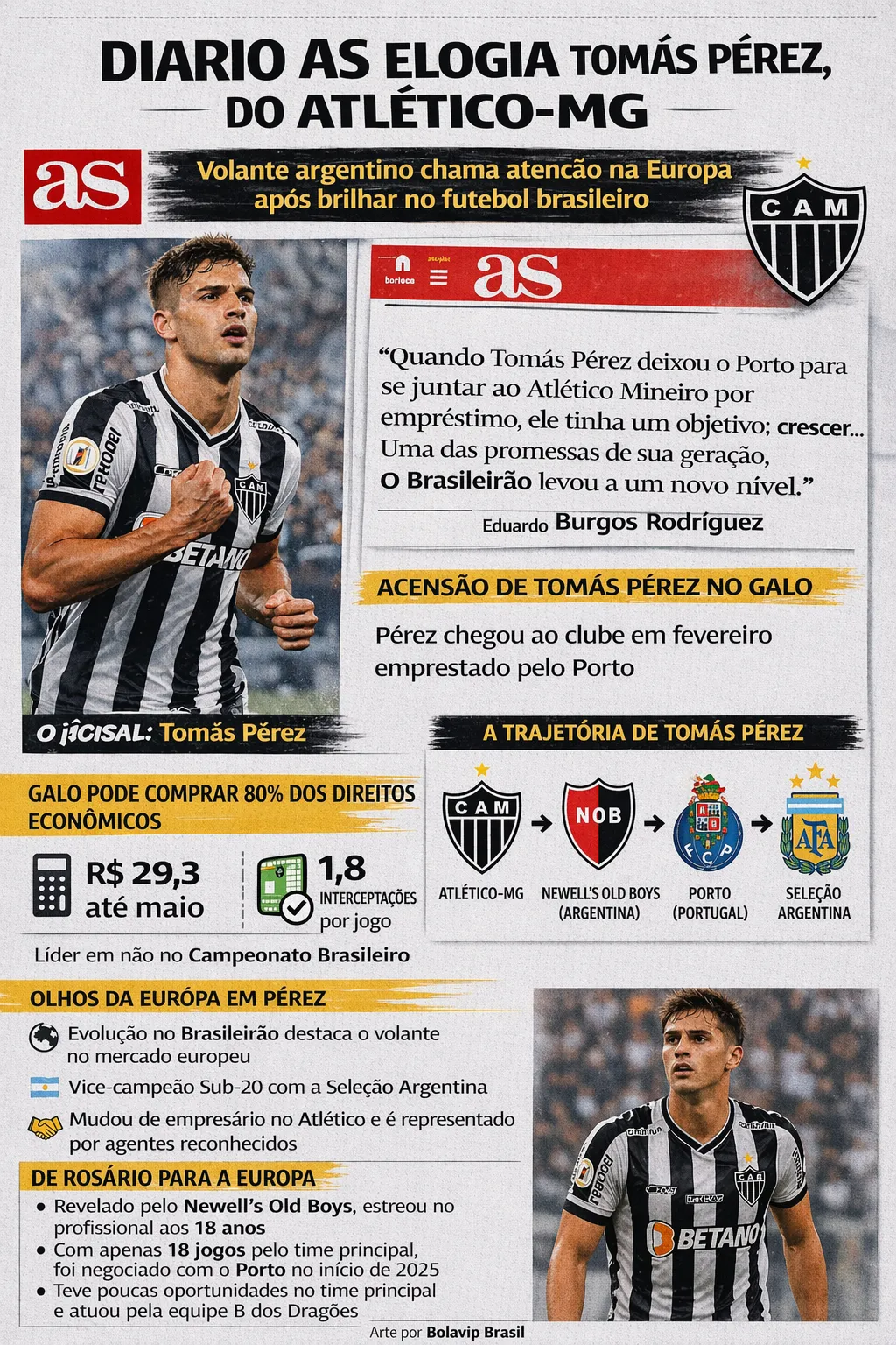 “Quando Tomás Pérez deixou o Porto para se juntar ao Atlético Mineiro por empréstimo, ele tinha um objetivo: crescer. Uma das promessas de sua geração, ele encontrou o espaço necessário para se afirmar como jogador em Minas Gerais. O Brasileirão o levou a um novo nível”, afirmou a publicação assinada por Eduardo Burgos Rodríguez.