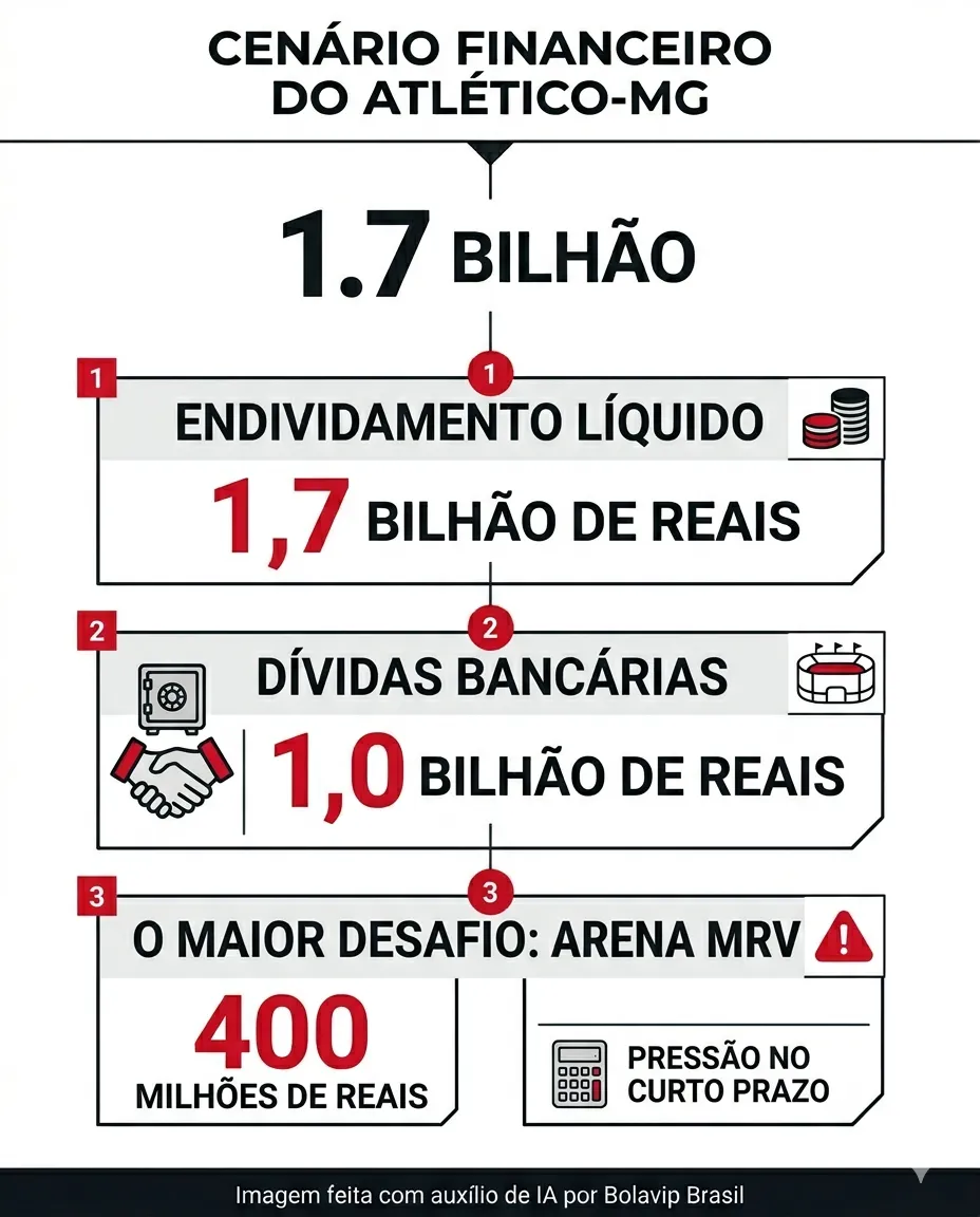 Mesmo assim, o clube ainda terá compromissos relevantes, como a dívida ligada à Arena MRV, o que mantém o cenário desafiador. A avaliação interna é de que o nível atual de endividamento é alto, embora haja melhora gradual quando comparado à receita ao longo dos últimos anos.