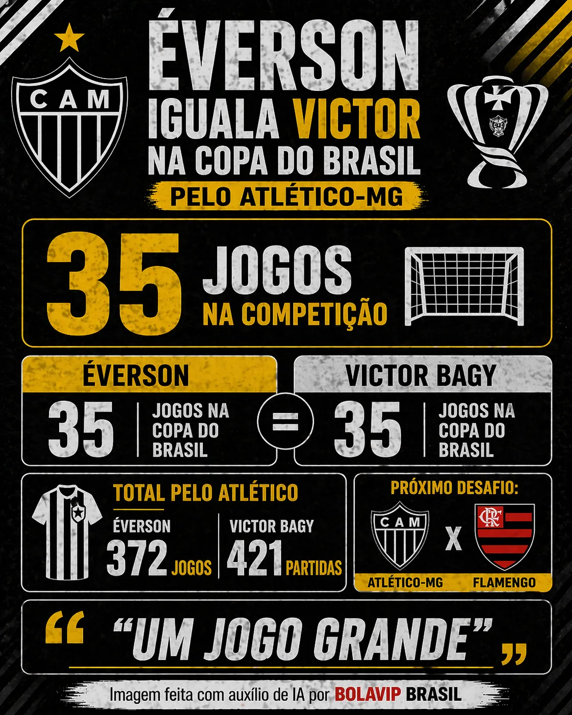 Com a atuação de ontem, o atual goleirão atleticano chegou a 372 jogos pelo Alvinegro, enquanto Victor se aposentou com 421. Isto é, Éverson precisa de mais 50 jogos para conseguir o recorde, algo que pode acontecer em 2027.