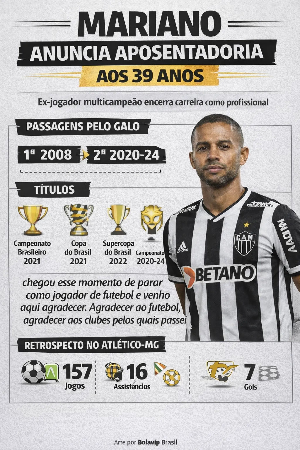 Enquanto os jogadores do Galo buscam reagir na temporada, um ex-atleta e multicampeão pelo clube anunciou sua aposentadoria dos gramados aos 39 anos. Trata-se de Mariano, que teve duas passagens pelo clube, com a primeira em 2008, enquanto a segunda foi entre 2020 e 2024.