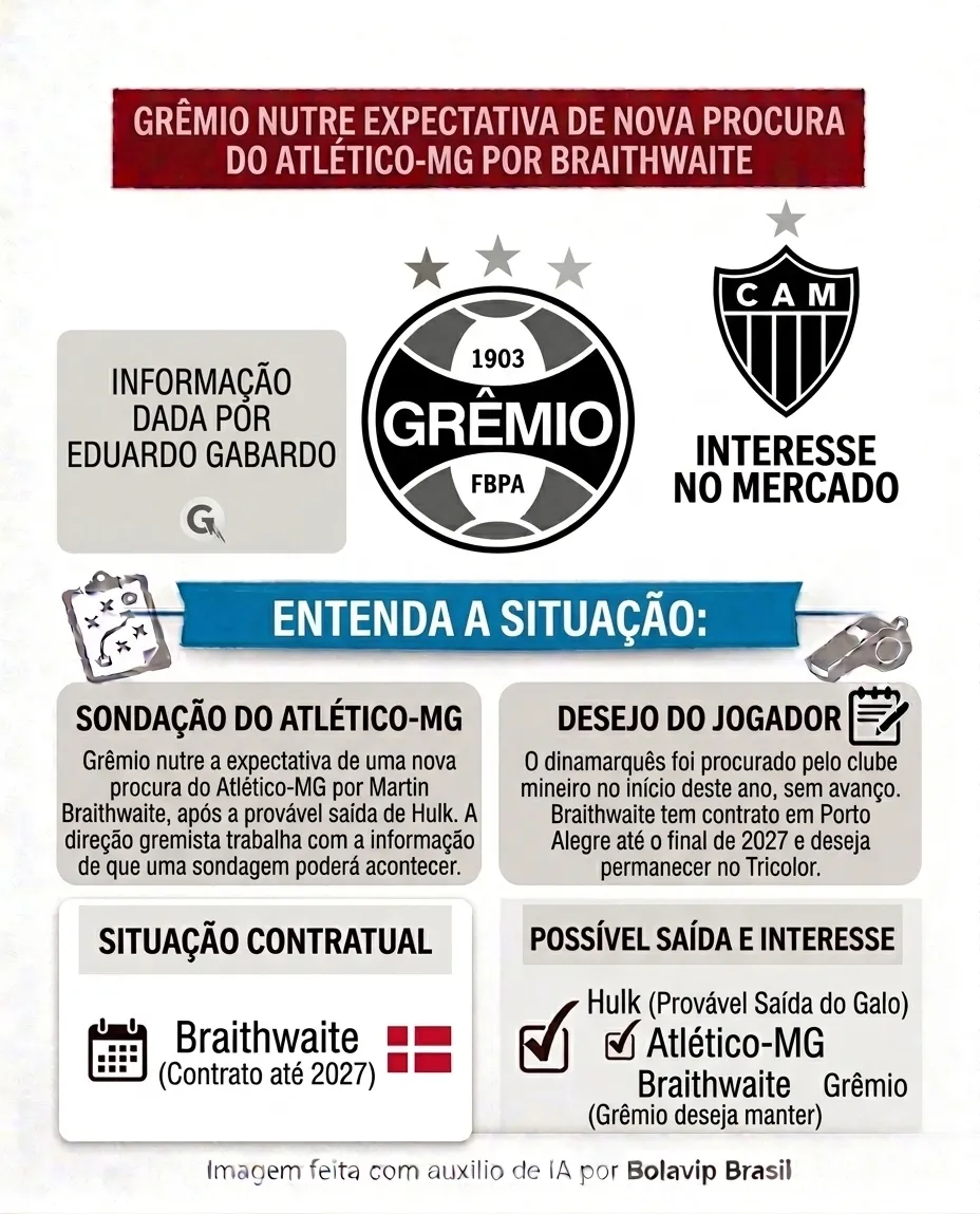 O dinamarquês foi procurado pelo clube mineiro no início deste ano, sem avanço. Braithwaite tem contrato em Porto Alegre até o final de 2027 e deseja permanecer no Tricolor“, publicou o portal Grêmio Info, dando os devidos créditos.