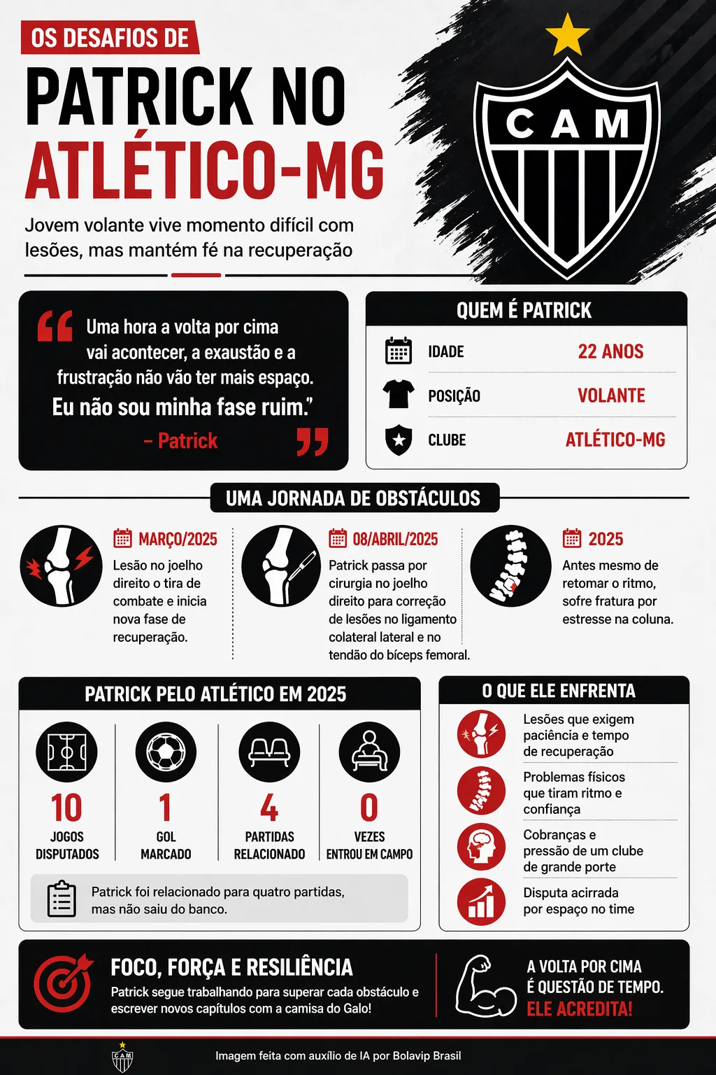 Patrick tenta, mais uma vez, driblar o adversário mais incômodo para qualquer atleta: o próprio corpo. No Atlético, sua trajetória recente tem sido menos sobre bola e mais sobre Departamento Médico. Em 8 de abril, foi submetido a uma cirurgia no joelho direito, intervenção necessária para corrigir lesões no ligamento colateral lateral e no tendão do bíceps femoral.