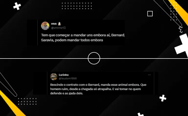“Rescinde o contrato com o Bernard, manda esse animal embora. Que homem ruim, desde a chegada só atrapalha. E vai tomar no quem defende ele”, reclamou um torcedor do Galo nas redes sociais sobre o ídolo.