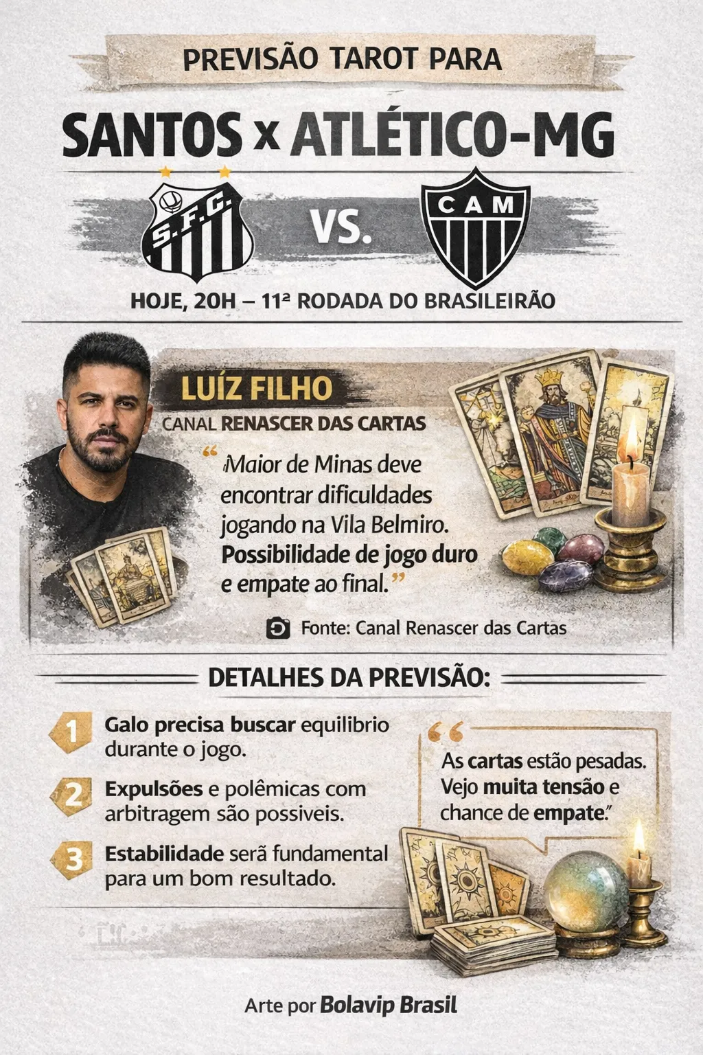 “As cartas do jogo estão pesadas, então pede intuição e visão de jogo. Vejo um jogo difícil e duro, com chance de expulsão. Então a gente tem sim grande possibilidade de empate nesse jogo, tá? Mas eu vejo as energias um pouco melhores para o Santos”, destacou o tarólogo.