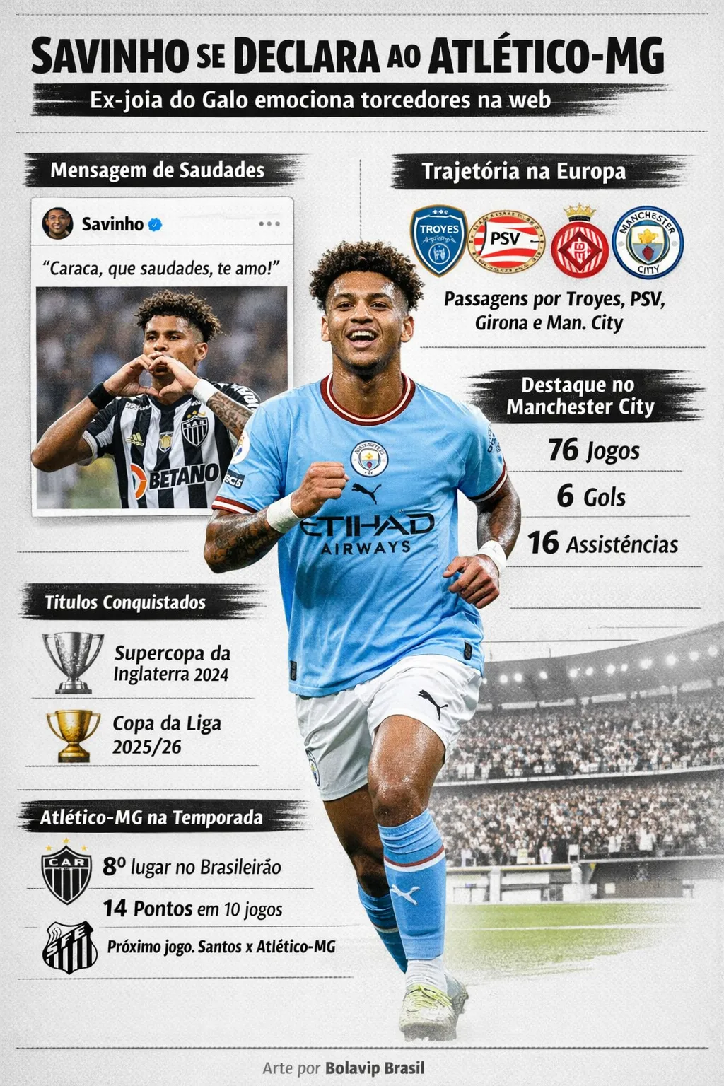Enquanto os atuais jogadores do Galo buscam uma nova vitória com a camisa atleticana, um ex-atleta da equipe ganhou destaque nas redes sociais. Savinho, atualmente no Manchester City (Inglaterra), demonstrou carinho pelo Atlético-MG na última sexta-feira (10).