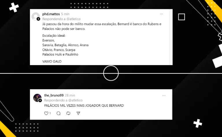Na rede social do Threads, a torcida atleticana também apontou que o atacante Brahian Palacios mudou o jogo de hoje e foi fundamental para a virada acontecer. O colombiano entrou no intervalo na vaga do volante Otávio.
