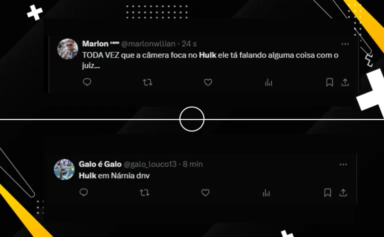 “Hulk em Nárnia“, disse um torcedor durante o 2° tempo. Outro atleticano pontuou o seguinte sobre o jogador: “Gente, ele não está conseguindo dominar uma bola hoje“.