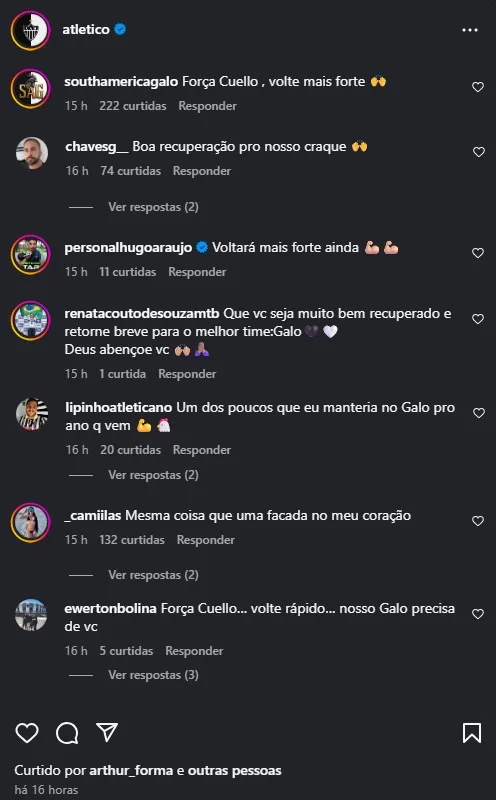 Logo após o comunicado oficial, a torcida alvinegra mobilizou as redes sociais em apoio ao atleta. Frases como “Força, Cuello!”, “Vai voltar melhor que antes!” e “Estamos com você, hermano!” tomaram conta dos comentários no perfil do Galo.