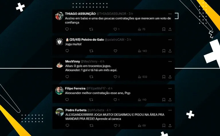 No X (antigo Twitter), mensagens exaltando o jovem volante dominaram a timeline. “Melhor contratação do ano, sem dúvidas!”, escreveu um torcedor. Outro comparou sua entrega em campo com reforços de temporadas passadas: “Allan: 0 gols em anos de Galo. Alexsander: 1 gol em um mês. Craque!”.