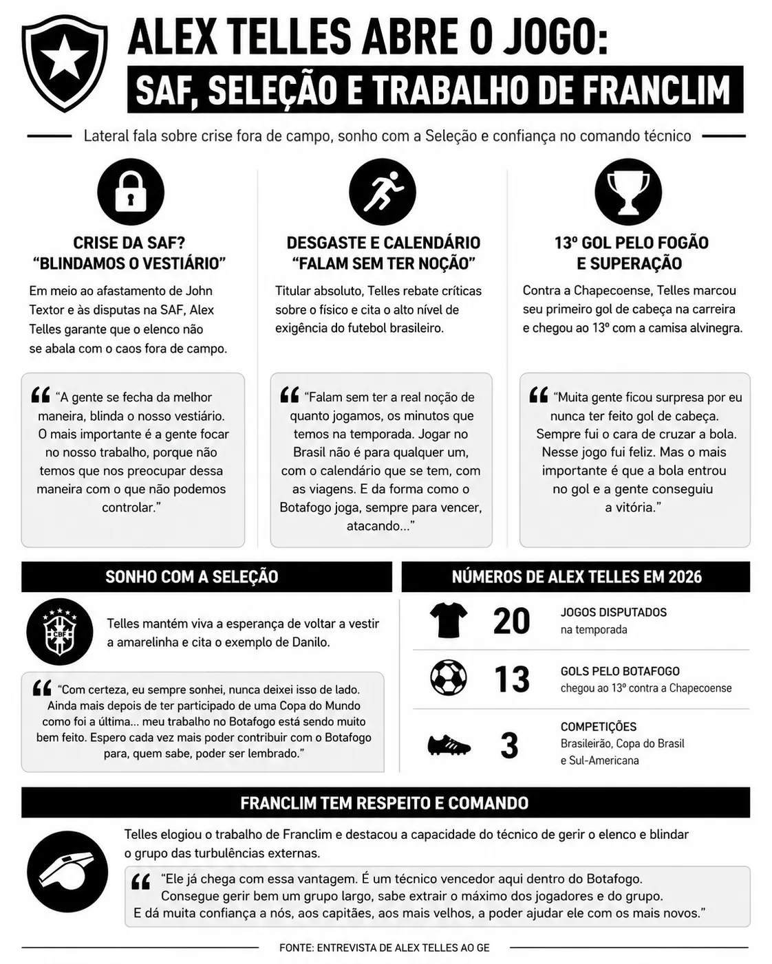 Em meio aos dias turbulentos nos bastidores da SAF do Botafogo, Alex Telles tratou de reforçar o discurso de blindagem no elenco e garantiu que o grupo segue focado apenas dentro de campo em entrevista ao Globo Esporte.