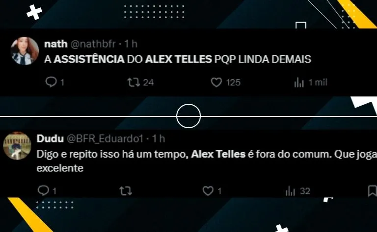 “O cruzamento do Alex Telles é de um jogador de copa do mundo que recebe mais de 1 milhão. ADAPTANDO JOGANDO DECISÕES. FACILMENTE MELHOR LATERAL ESQUERDO DO PAÍS”, publicou um torcedor.