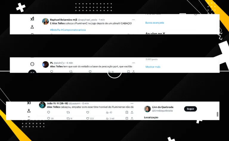 Nas redes sociais, torcedores alvinegros não perdoaram e decretaram Telles como um dos piores do time em campo. E olha que o atacante Matheus Martins, que jogou aberto pelo lado esquerdo, perdeu gol feito na reta final do clássico.