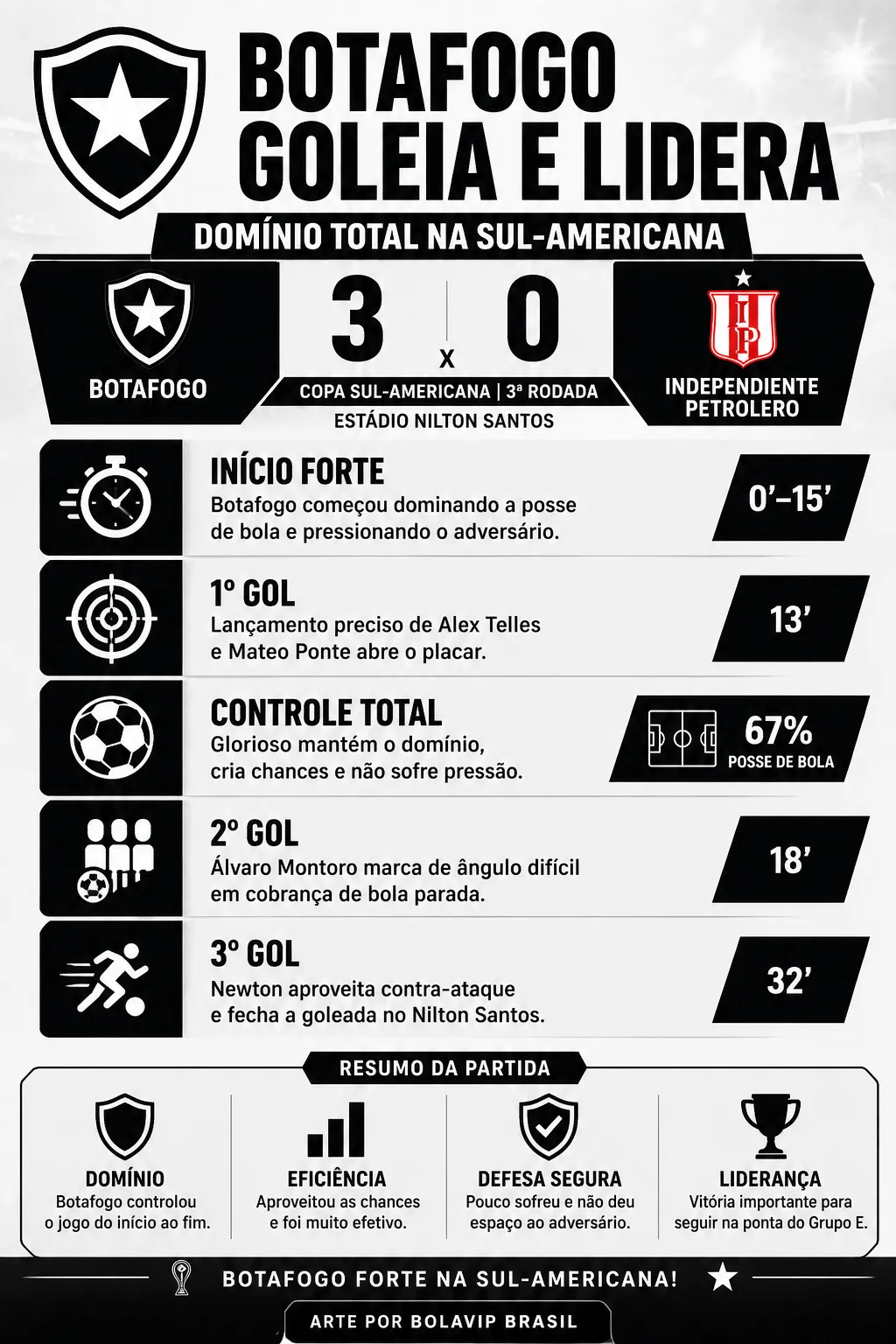 Botafogo domina, goleia Independiente Petrolero e mantém liderança com atuação consistente no Nilton Santos