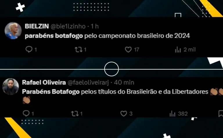 Outro seguiu na mesma linha e disparou: “Parabéns Botafogo de Futebol e Regatas pelo título do Campeonato Brasileiro de 2024 e pelo título da Copa Libertadores da América 2024. Vocês merecem”.