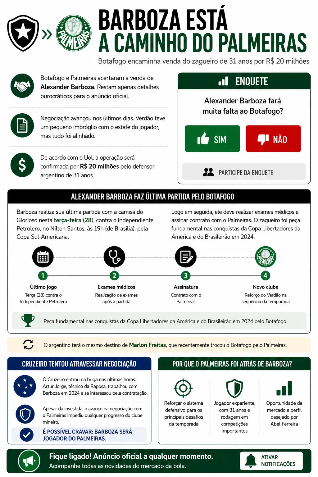 Nas últimas horas, o Cruzeiro entrou na briga e buscou a contratação de Barboza, mas não teve sucesso. Atual técnico da Raposa, Artur Jorge trabalhou com o jogador em 2024 e se interessou pela negociação.