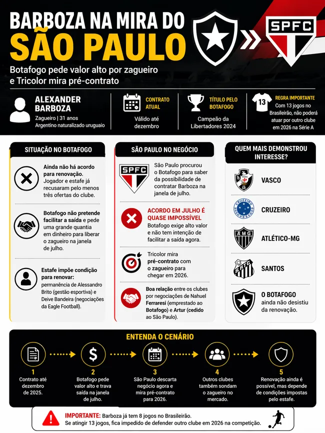De acordo com Rafael Emiliano, o São Paulo ouviu que o Botafogo não pretende facilitar uma saída de Barboza e pedem uma grande quantia em dinheiro para liberar o uruguaio na janela de julho.