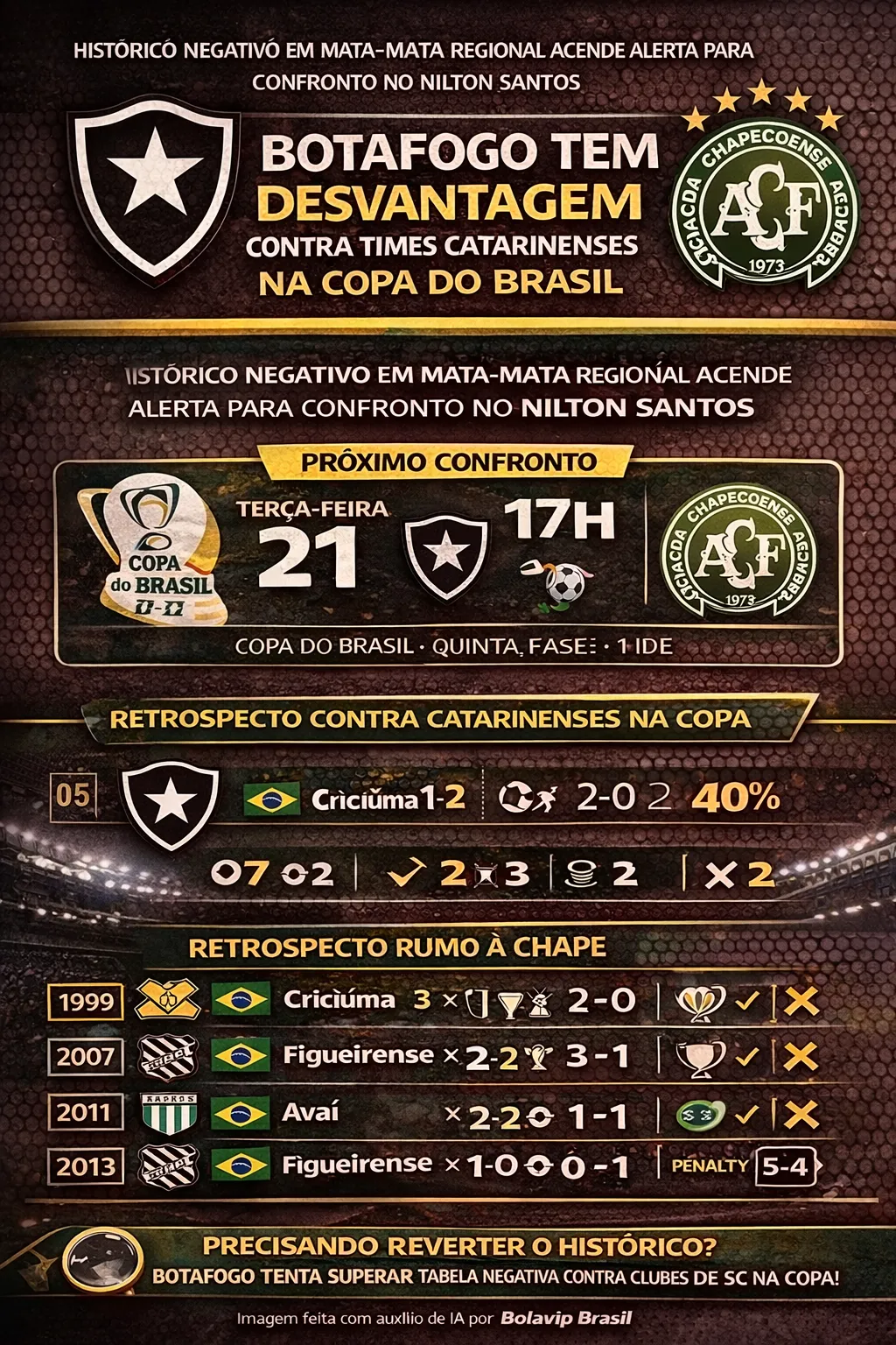 O Glorioso enfrentará a Chapecoense pela primeira vez na principal competição mata-mata do Brasil, mas enfrentar equipes catarinenses não é novidade para o Fogão, que leva desvantagem nos duelos. Em cinco confrontos, o Alvinegro avançou apenas duas vezes, com apenas 40% de aproveitamento na história.
