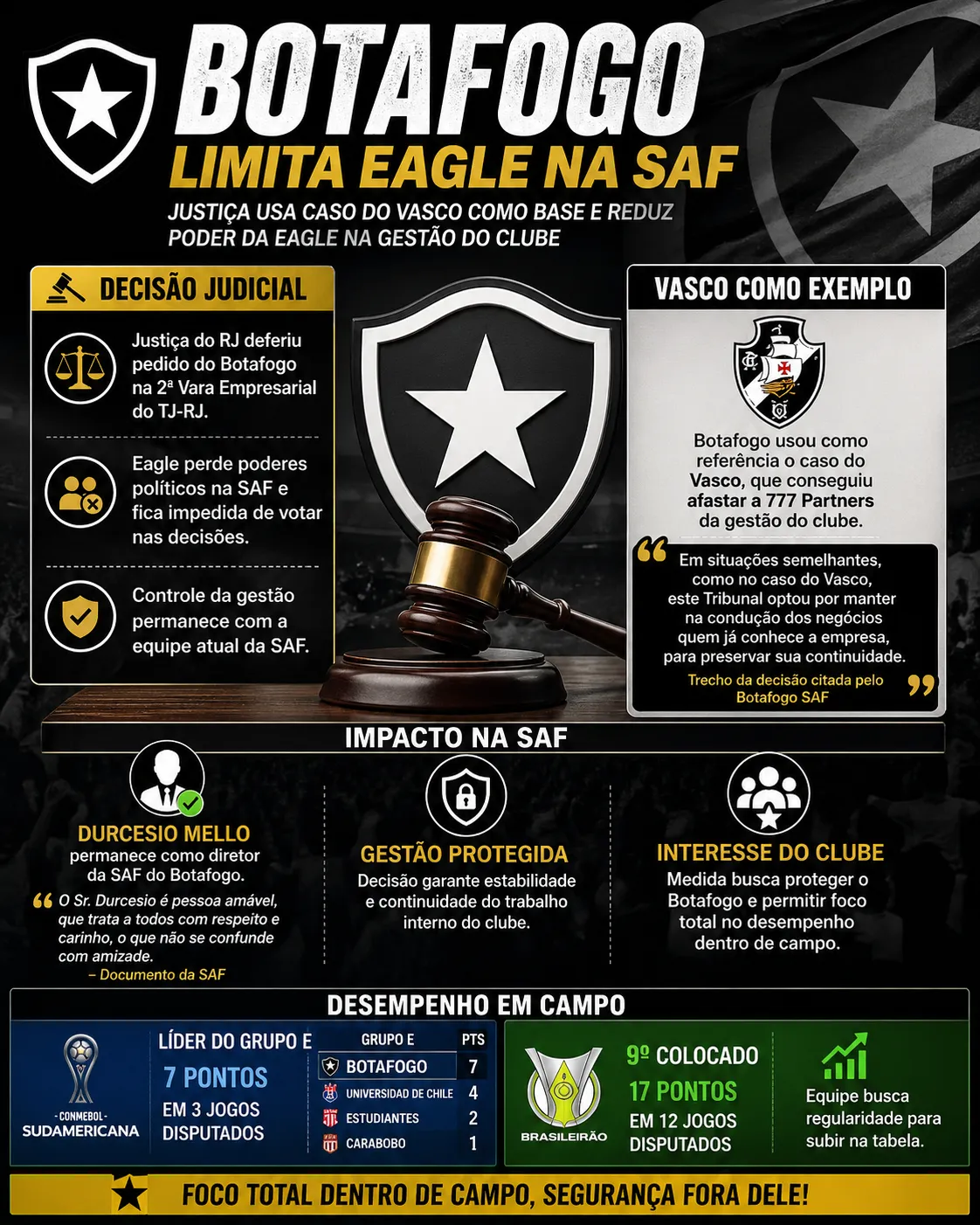 O Botafogo utilizou o Vasco e a operadora telefônica Oi para conseguir retirar os poderes políticos da Eagle através da Justiça, o que acabou sendo concedido. Conforme informações da ESPN, que mostrou trechos da decisão que limitou a atuação da empresa.