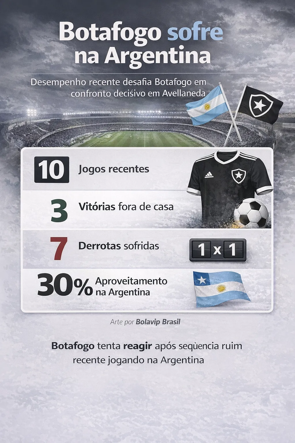 Por fim, foram mais duas derrotas na Argentina. Pela Recopa Sul-Americana de 2025, o Glorioso perdeu justamente para o Racing por 2 a 0, em Avellaneda. Já pela Libertadores de 2025, o Botafogo foi derrotado por 1 a 0 pelo Estudiantes, em La Plata.