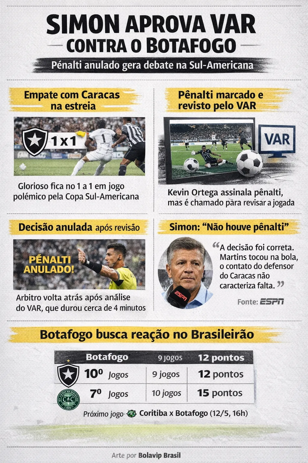 Um dos que concordaram com a decisão do árbitro Kevin Ortega foi Carlos Eugênio Simon, comentarista de arbitragem da ESPN. O profissional aprovou a decisão de anular o pênalti marcado a favor do Botafogo no fim do primeiro tempo da partida, em lance envolvendo Ferreira e Matheus Martins.