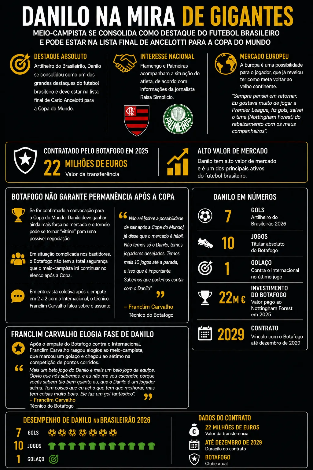 Artilheiro do Brasileirão, Danilo se consolidou como um dos grandes destaques do futebol brasileiro e deve estar na lista final de Carlo Ancelotti para a Copa do Mundo. Hoje no Botafogo, o meio-campista atrai o interesse do mercado nacional e internacional.