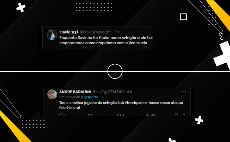 “Luiz Henrique bancar nessa seleção é brincadeira!”. “Enquanto Savinho for titular numa seleção onde Luiz Henrique joga, empataremos como empatamos com a Venezuela”. “Tudo, o melhor jogador da Seleção, Luiz Henrique, ser banco nesse ataque feio é imoral”, reclamaram torcedores.