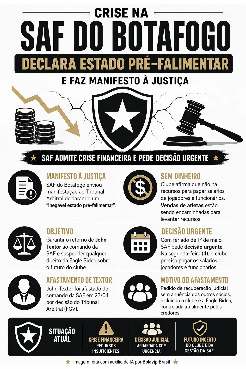 Diante do feriado do Dia do Trabalho, que é na próxima sexta-feira (1), a SAF do Glorioso pede que a decisão seja tomada em caráter de urgência. Isso porque, já na próxima segunda, dia 4, o clube carioca tem que pagar os salários de jogadores e funcionários.
