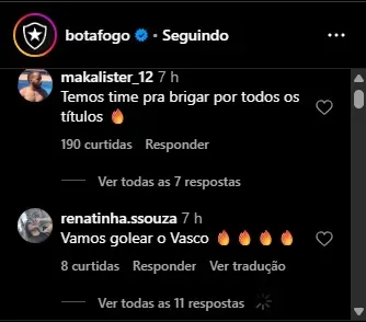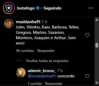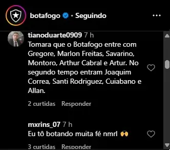 Os torcedores botafoguenses movimentaram as redes sociais, projetando o elenco titular para encarar o rival. Um dos palpites mais populares sugeriu: “Minha escalação para a temporada: John, Vitinho, David Ricardo, Barboza, Cuiabano, Gregore e Marlon Freitas, Arthur, Savarino, Montoro, Joaquin Correa”