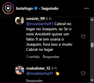 Outro torcedor foi ainda mais ousado, propondo alterações específicas no ataque: “Cabral no lugar do Joaquim. Só usaria o Joaquim como falso 9 se o mini Ancelotti quiser ousar, fora isso é muito Cabral nesse time!”