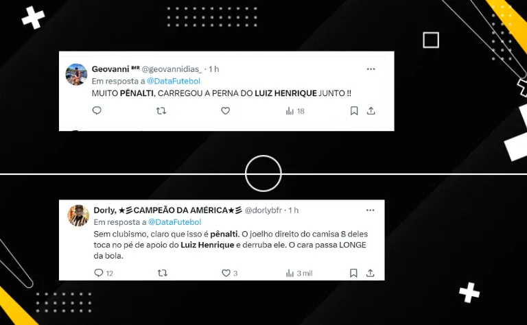 “Sem clubismo, claro que isso é pênalti. O joelho direito do camisa 8 deles toca no pé de apoio do Luiz Henrique e derruba ele. O cara passa LONGE da bola”, comentou outro botafoguense na rede social do X.