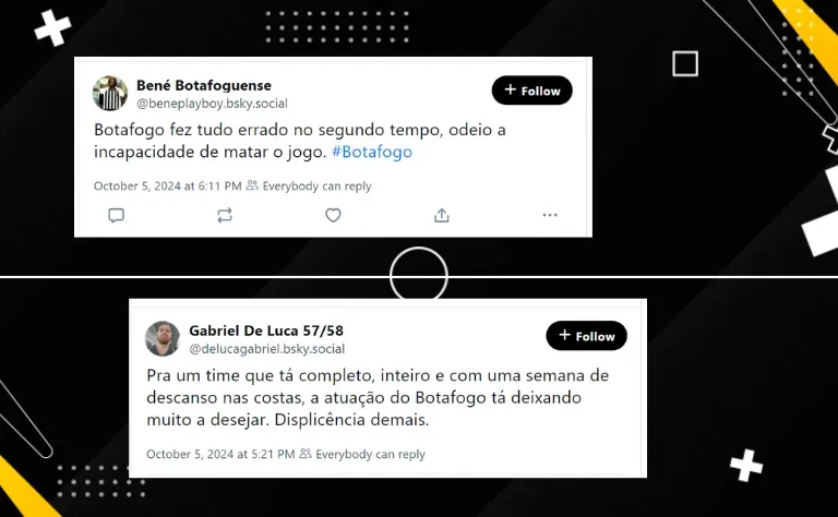 “Botafogo novamente abre mão do jogo e vai ser no desespero como sempre”, disse outro torcedor nas redes sociais. Os botafoguenses consideram que o time de Artur Jorge recuou demais na etapa final.