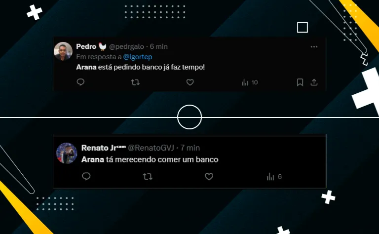 Ao longo dos 90 minutos, a torcida do Atlético Mineiro também pediu a saída do jogador da equipe titular: “Está na hora do Arana ir para o banco de reservas“. “Eu já trocava ele e colocava o Rubens no jogo“.