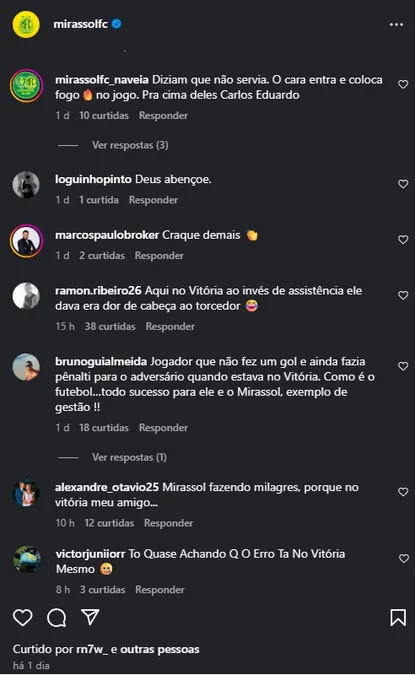 Nas redes sociais, do Mirassol torcedores do Vitória não deixaram passar a boa fase do atleta. Muitos lembraram com ironia das dificuldades enfrentadas no clube baiano. “Não teve uma boa passagem pelo vitória mas desejo sucesso!”, comentou um usuário. Outro foi ainda mais direto: “Mirassol fazendo milagres, porque no vitória meu amigo…“