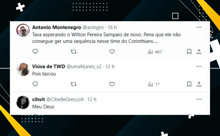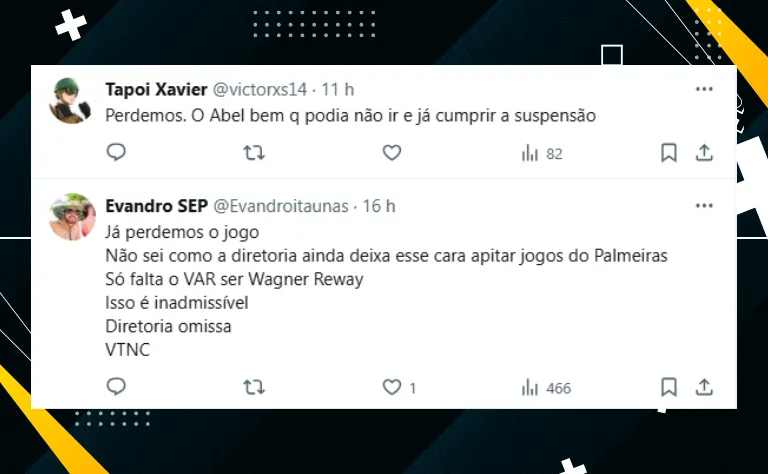 Por fim, se o Timão ocupa o 11º lugar na tabela de classificação, com 25 pontos conquistados, o Verdão quer complicar a vida do rival e aproximá-lo do Z-4. Confira a reação dos palestrinos com o nome de Ramon Abel: