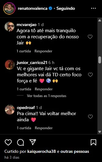 Questionado sobre o tempo de recuperação, Renato explicou que dependerá da cirurgia, mas segue o protocolo de 8 a 12 meses, semelhante ao período de recuperação da lesão anterior. Torcedores vascaínos rapidamente responderam à publicação com mensagens de carinho, demonstrando apoio ao craque.