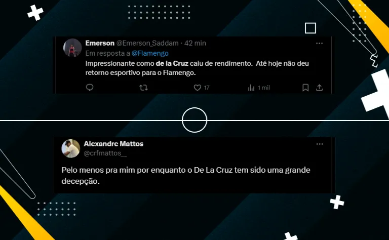 “Mais um jogo em que ele não consegue aparecer para ajudar“. Um torcedor flamenguista também comentou algo parecido: “Isso é complicado! A gente precisa do De La Cruz, mas não consigo ver ele em campo“.