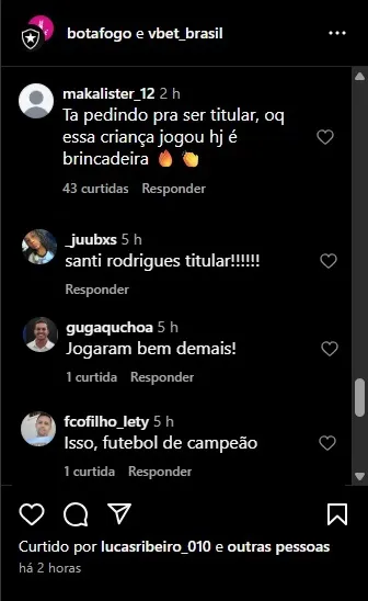 Entre os comentários mais comuns, torcedores declararam: “Tá pedindo pra ser titular, o que essa criança jogou hoje é brincadeira!”, “Merecidíssimo! Terceira partida jogando bem!”, “Craques!” e “Santi e Montoro de titulares, sem dúvida!”